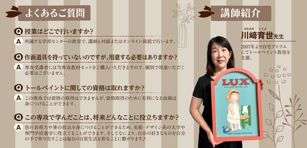 ※トールペイントは図案をもとに描くため、初心者にも取り組みやすいアート系専攻です。