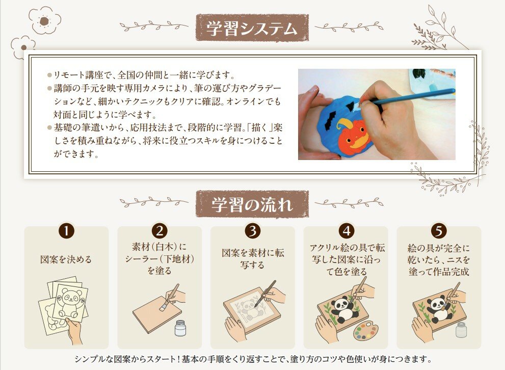 【特徴】◎初心者歓迎! 図案を使うので、絵が苦手な生徒さんでも安心です。◎生活を彩るアートとして楽しめます。 完成した作品は自宅やプレゼントとしても活用できます。◎将来につながるスキルを習得! 描く力や色彩感覚が身につき、自信と表現力が向上します。