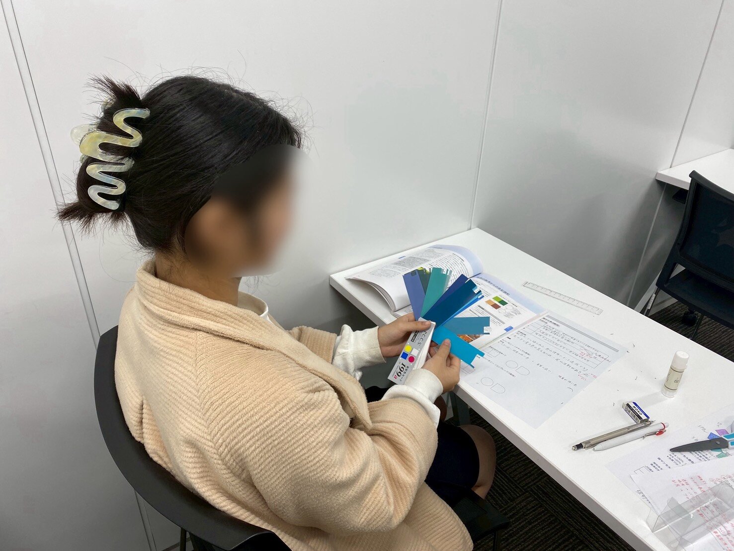 教材や配色カードを用いて、 実際に色を比べたり組み合わせを考えたりすることで、