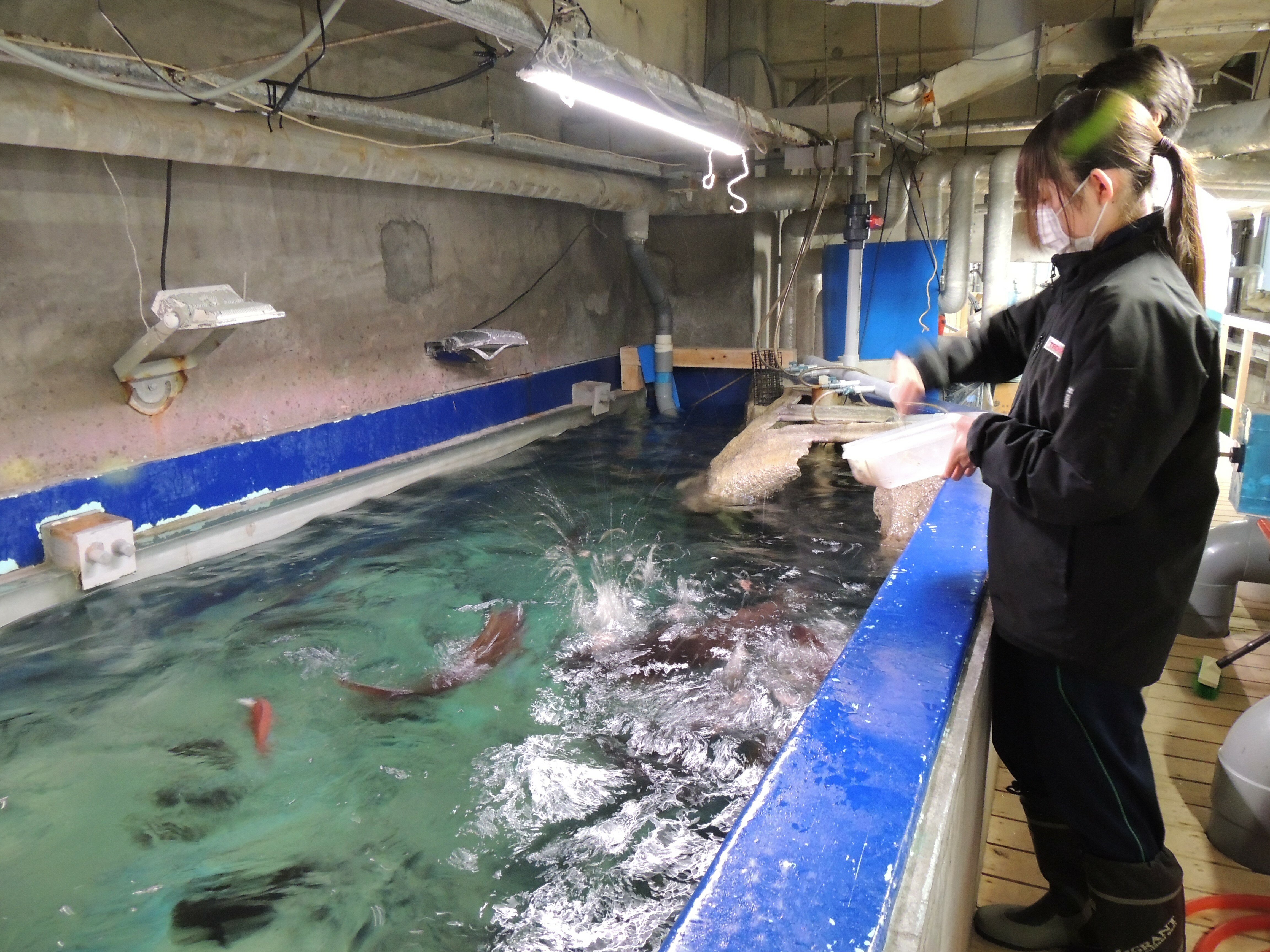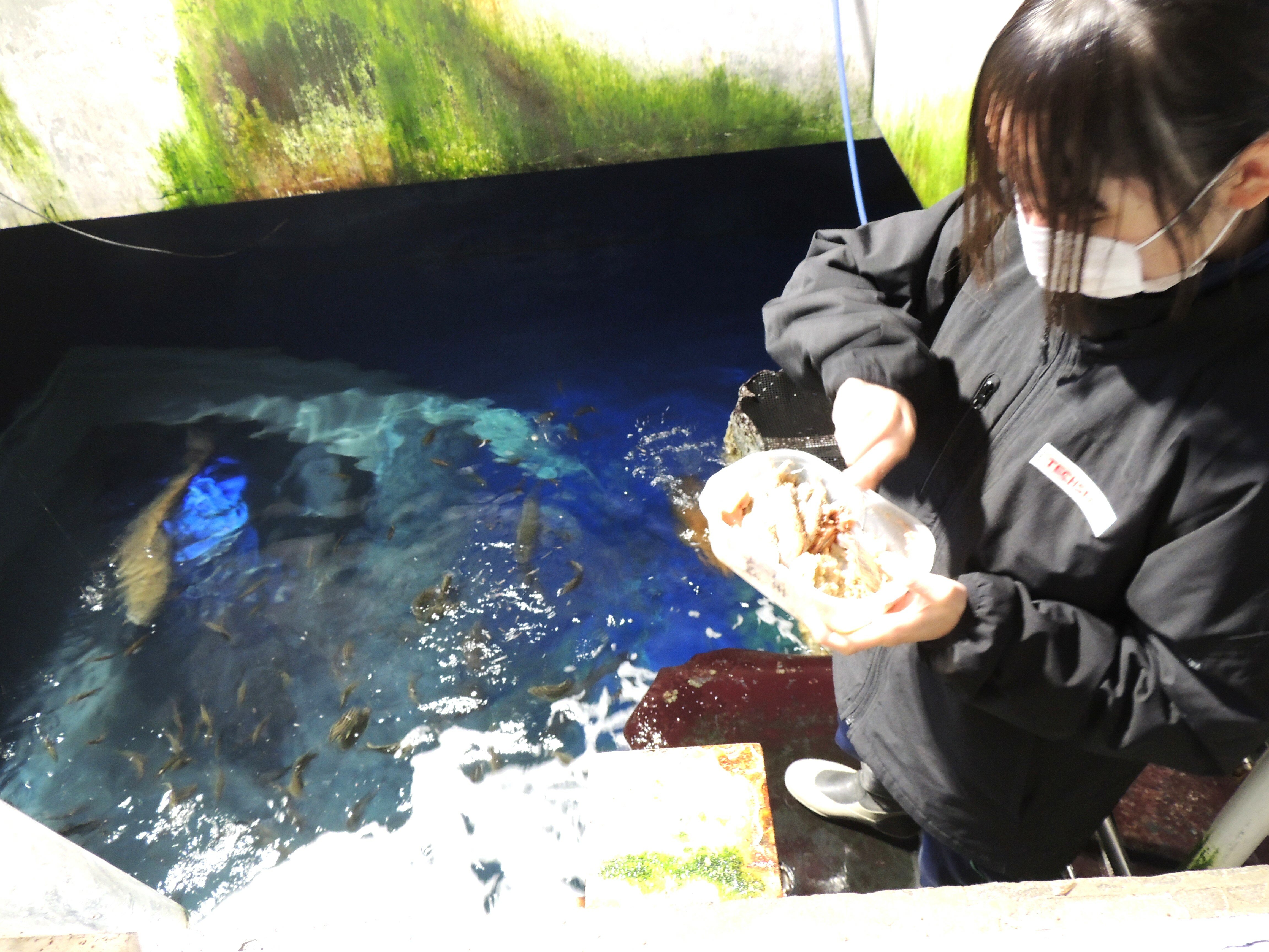 座学の後まず最初は魚たちへのエサやりです。