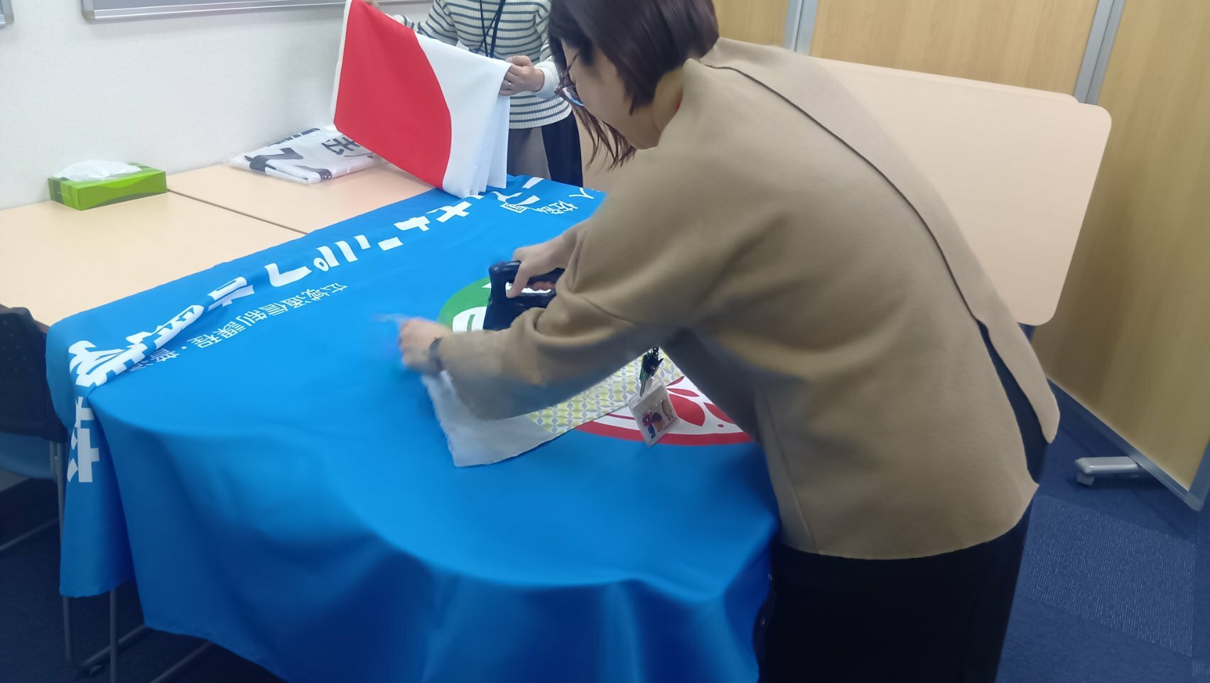 舞台上に掲揚する国旗や校旗のシワを伸ばすために