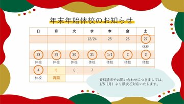12/27(土)~1/4(日)を休校とさせていただきます。