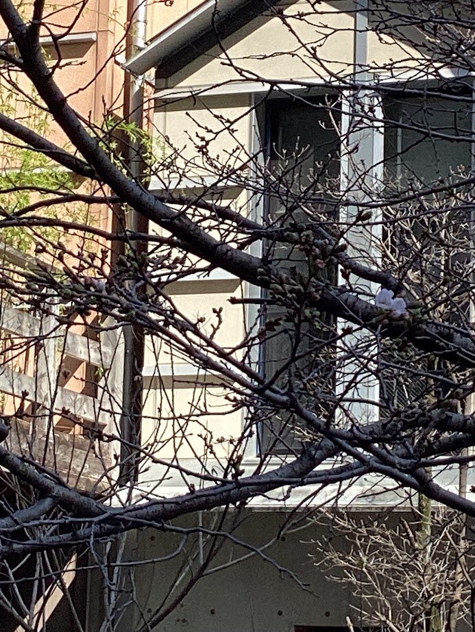 学習センター前の桜の様子を見に行くと、先週よりははるかに蕾が膨らみ、なんと開花しかけの花を発見しました。