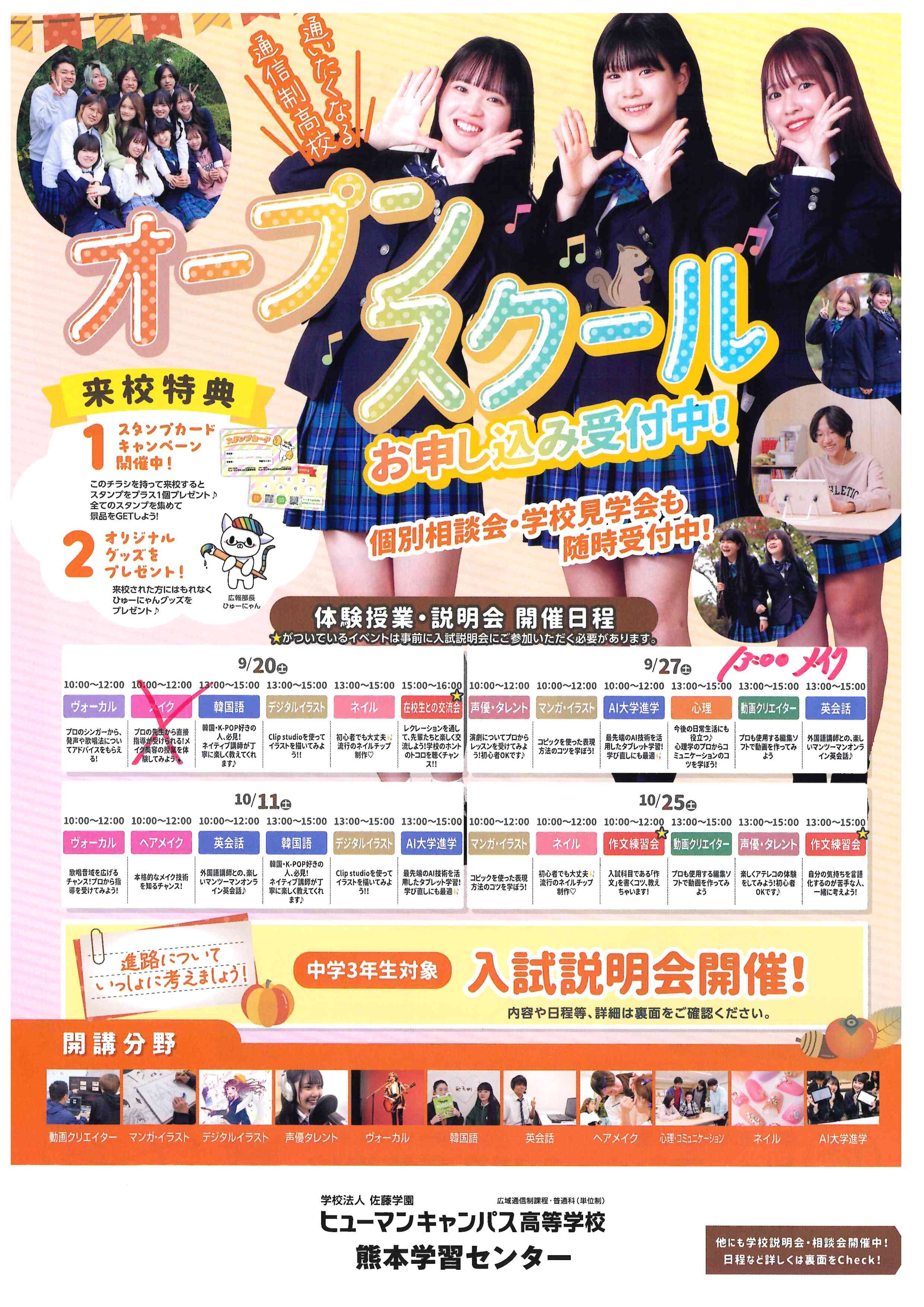 【熊本】9月10月のオープンスクールと入試説明会のご案内!