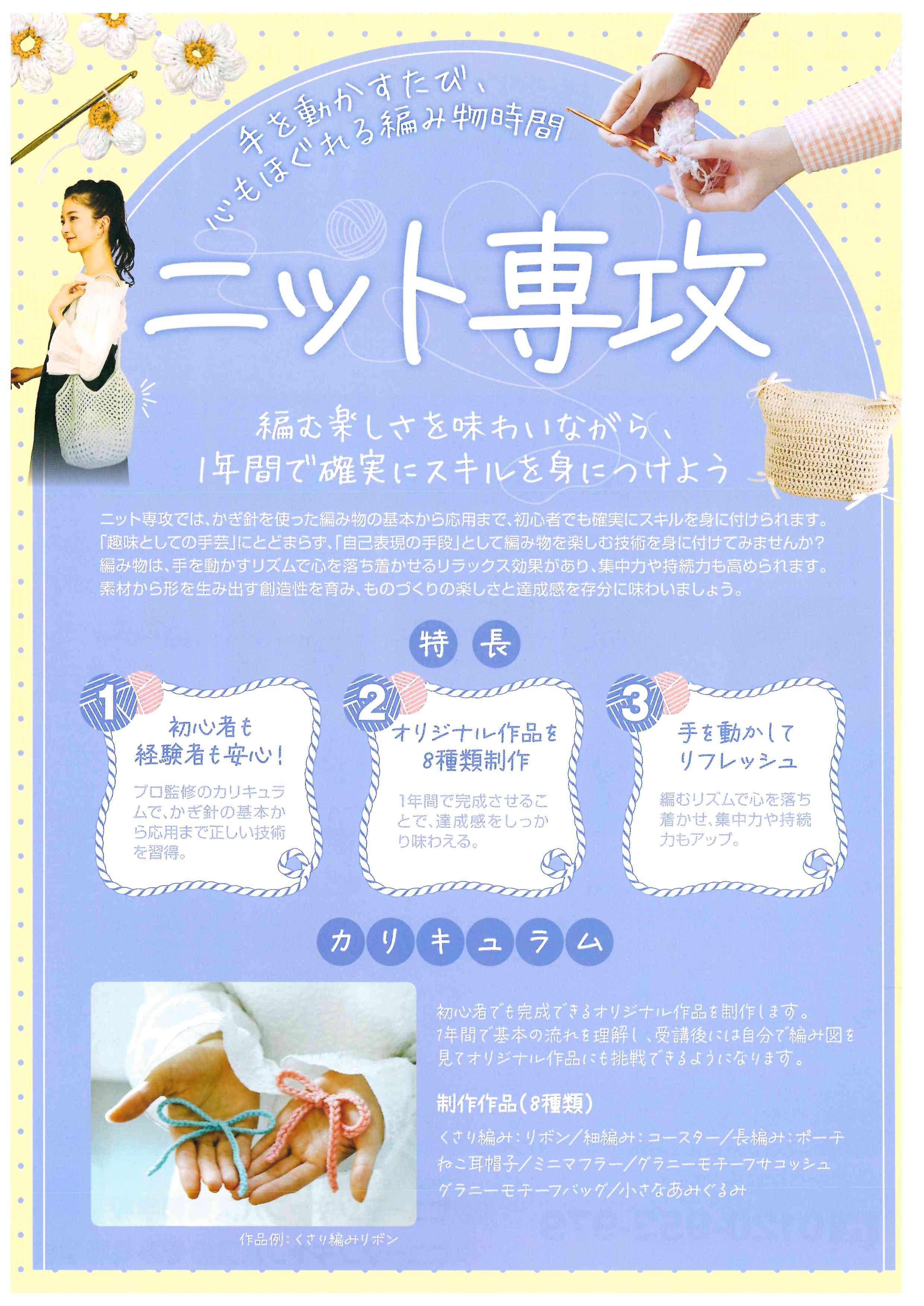 ニット専攻では、かぎ針を使った編み物の基本から応用まで、初心者でも確実にスキルを身に付けられます。「趣味としての手芸」にとどまらず、「自己表現の手段」として編み物を楽しむ技術を身に付けてみませんか?編み物は、手を動かすリズムで心を落ち着かせるリラックス効果があり、集中力や持続力も高められます。素材から形を生み出す創造性を育み、ものづくりの楽しさと達成感を存分に味わいましょう。