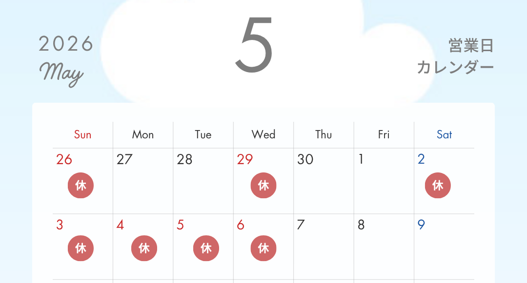4/29(水)、5/2(土)~5/6(水)が休校となります。