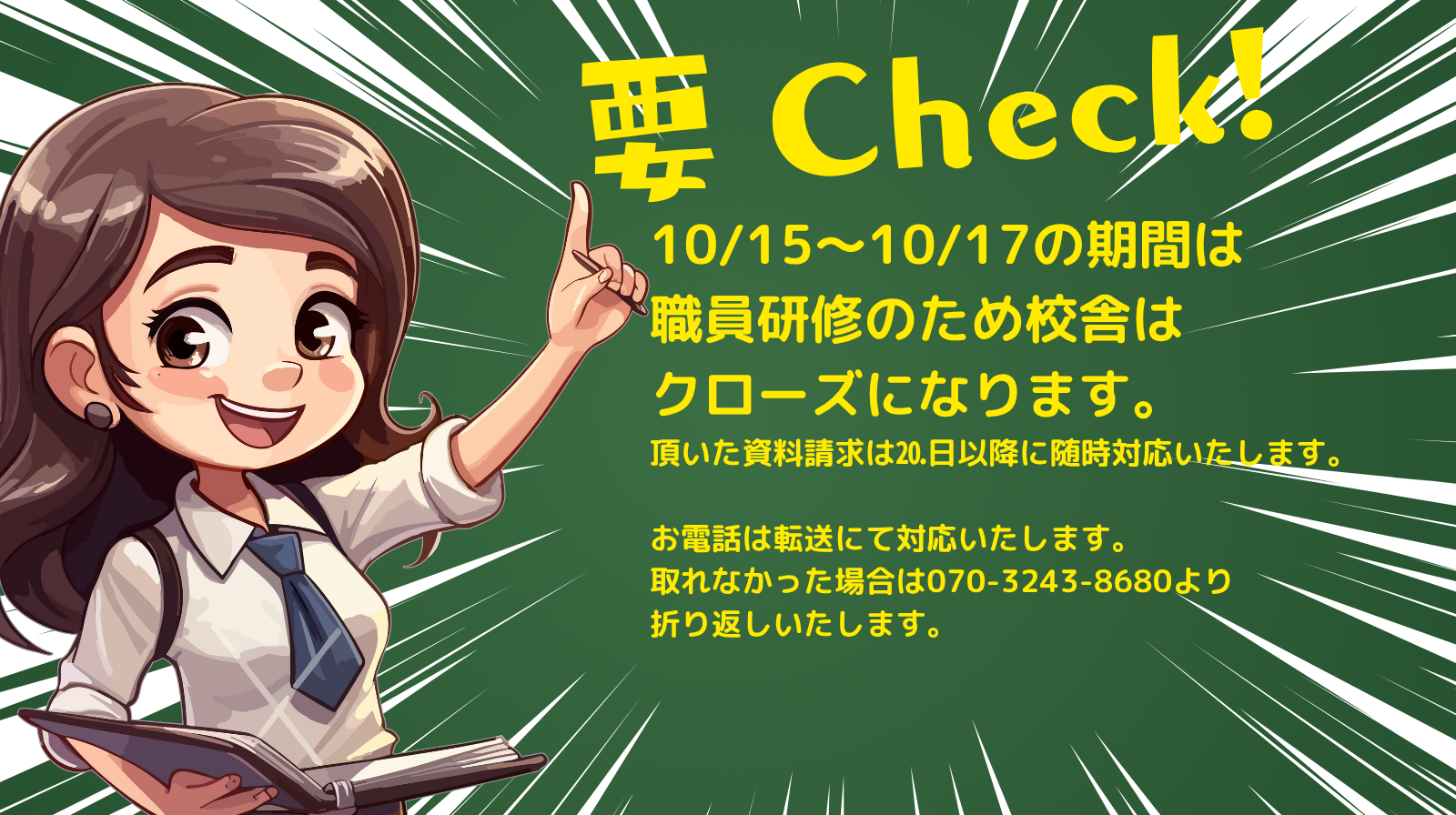 - 【大宮】10/15~10/17は職員研修のため校舎クローズになります。