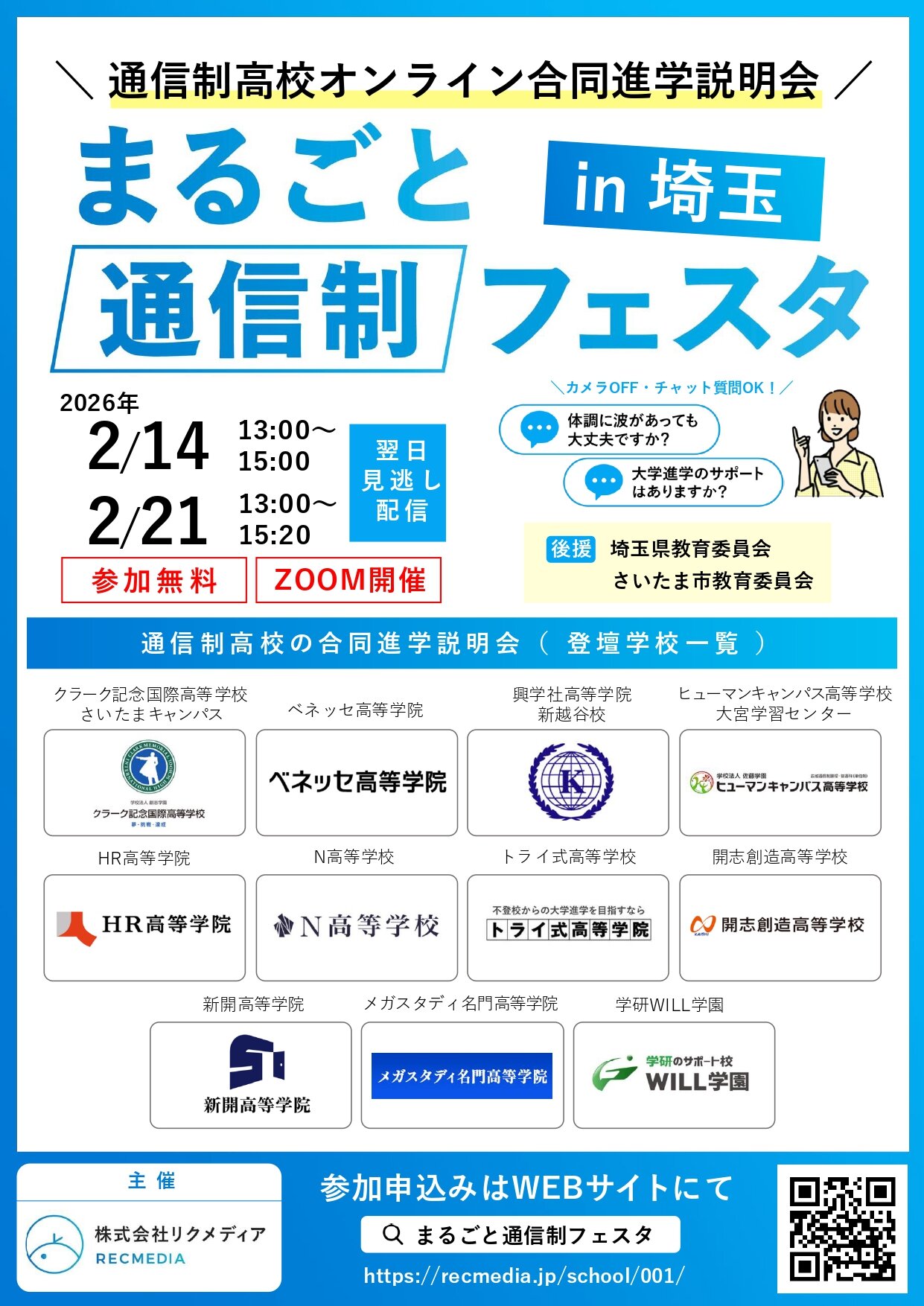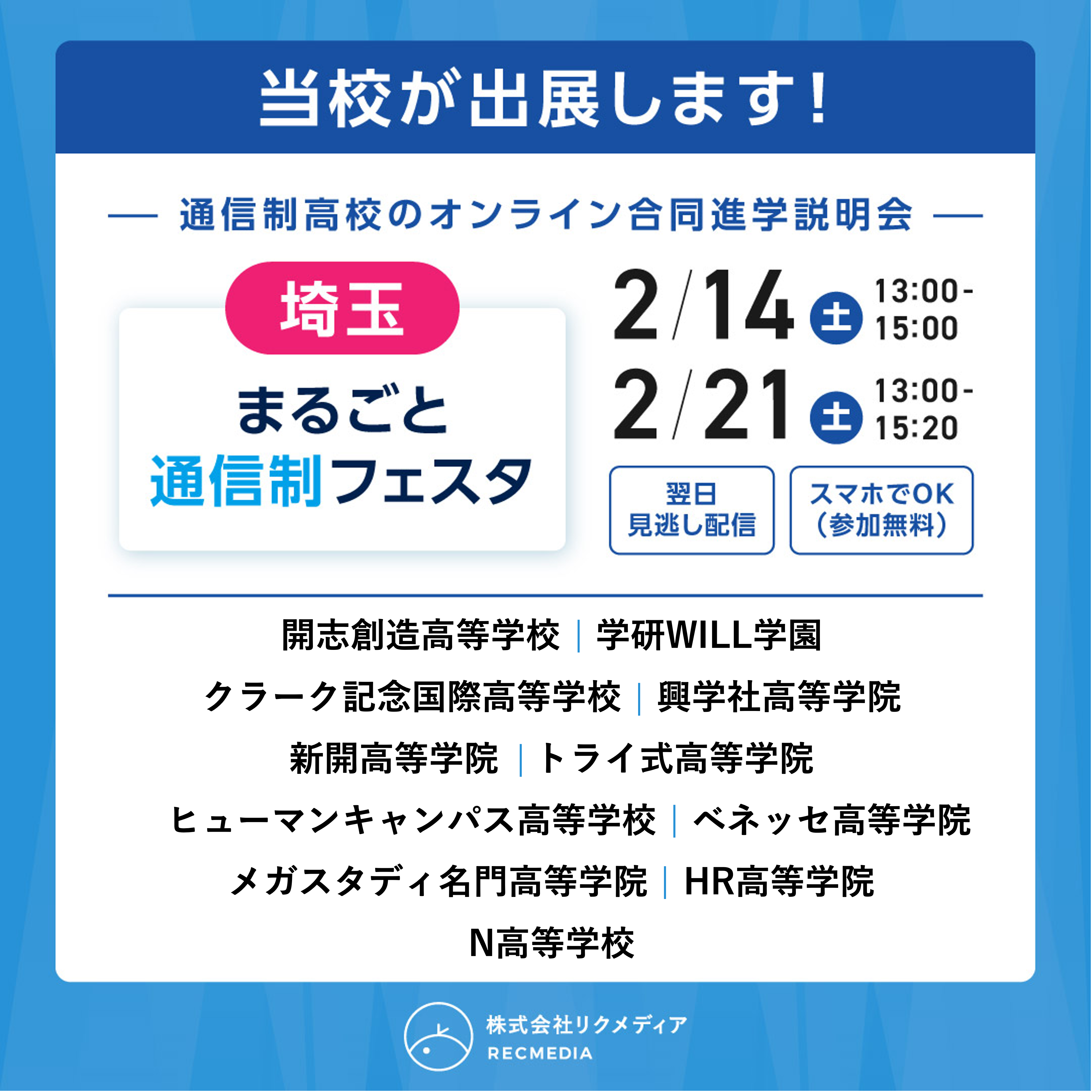 このたび、埼玉県を対象としたオンライン合同進学説明会「まるごと通信制フェスタ in 埼玉」に、当校の参加が決定いたしました!