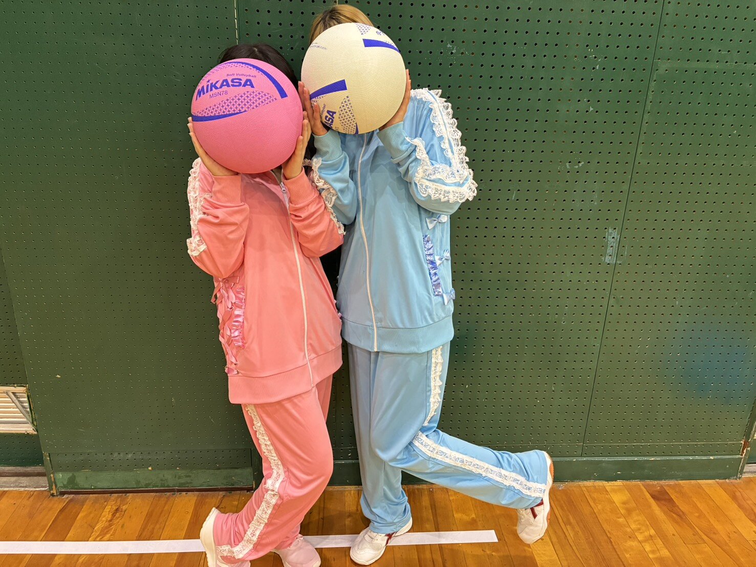 色違いのジャージにそれぞれリボンやフリルを付けて