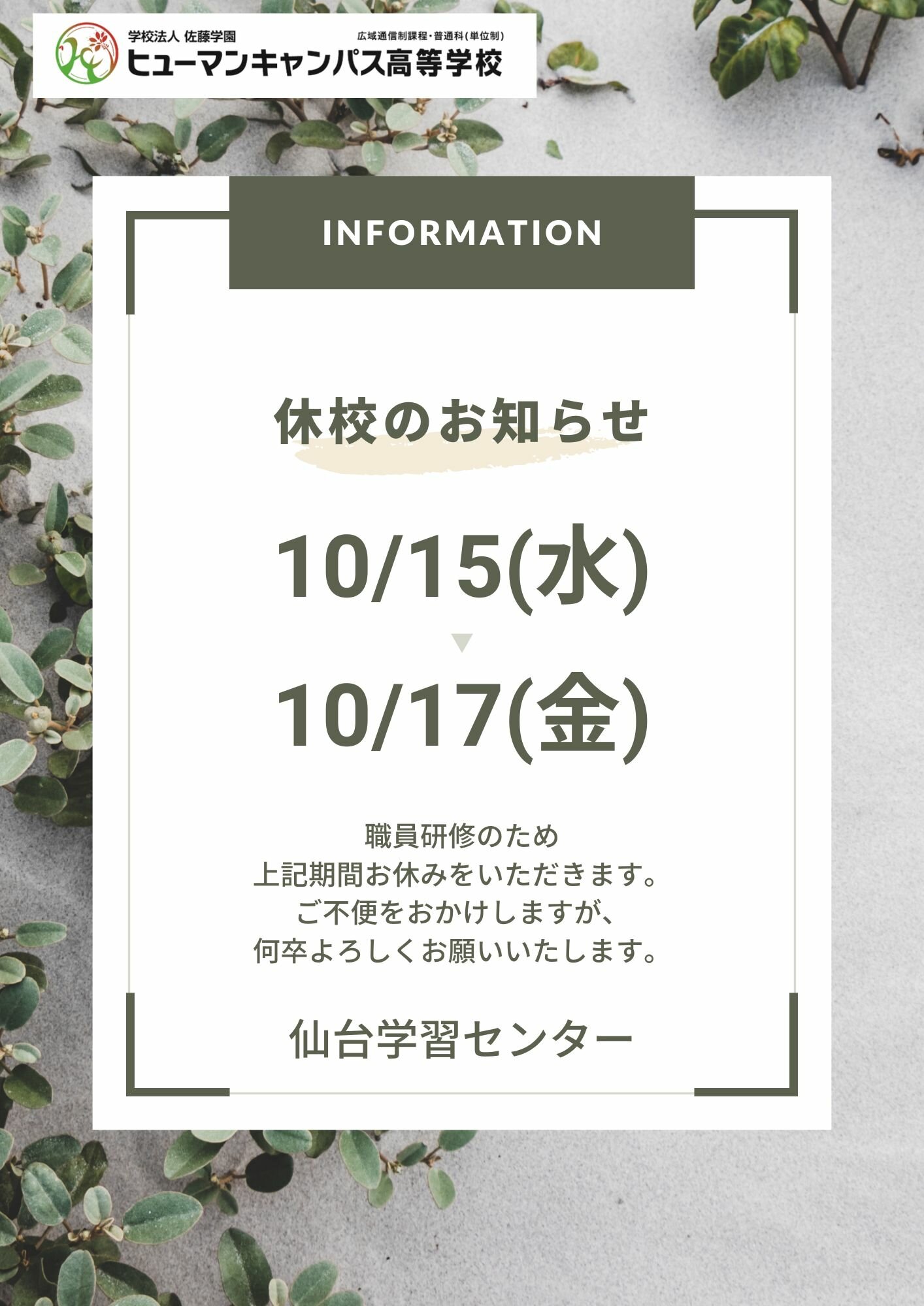 【仙台】10/15(水)~17(金) 職員研修による休校のお知らせ