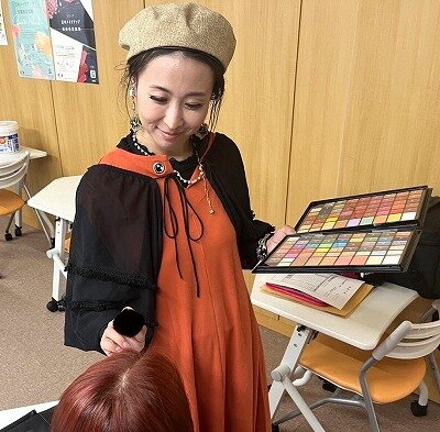 - メイクアップの基礎から応用まで、現場で活きる実践的なスキルを指導しています。単に技術を習得するだけでなく、色彩の選び方や顔立ちを活かすポイントなど、感性を磨くカリキュラムを大切にしています。また、セラピストを目指す方へのメンターとして、プロの現場で必要とされる立ち振る舞いや、お客様の心に寄り添うためのアドバイスも行っています。
