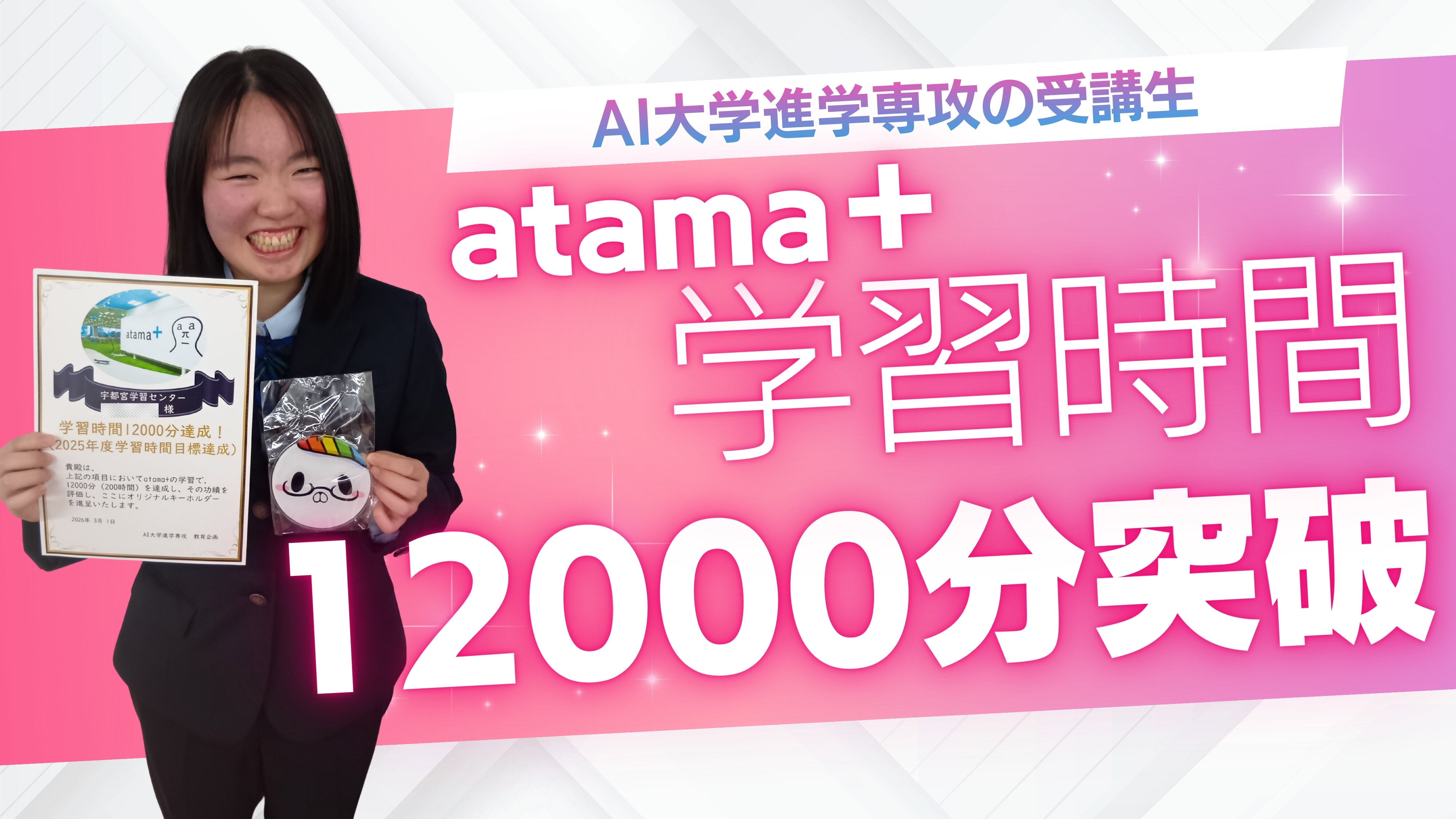 栃木 宇都宮にある通学型の通信制高校ヒューマンキャンパス高等学校宇都宮学習センターです当校の〈AI大学進学専攻〉で使用している学習教材「atama+」受講生の2年生が今年度のアプリ学習時間でクリアしたいと言っていた目標を達成しました😍表彰です!!!本当におめでとう\(^O^)/💗💗次年度はさらに学習時間を伸ばしていけるといいですね✨■ ■ ■ ■ ■ ■ ■ ■ ■ ■ ■個別の説明会開催中☞ご予約は校舎LINE・体験会検索ページから☜